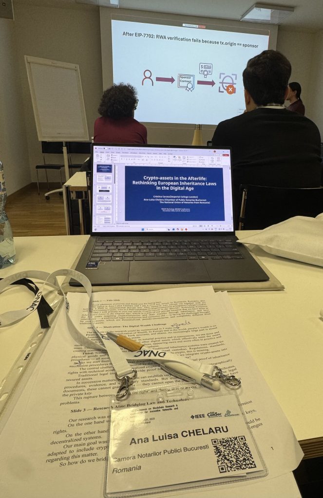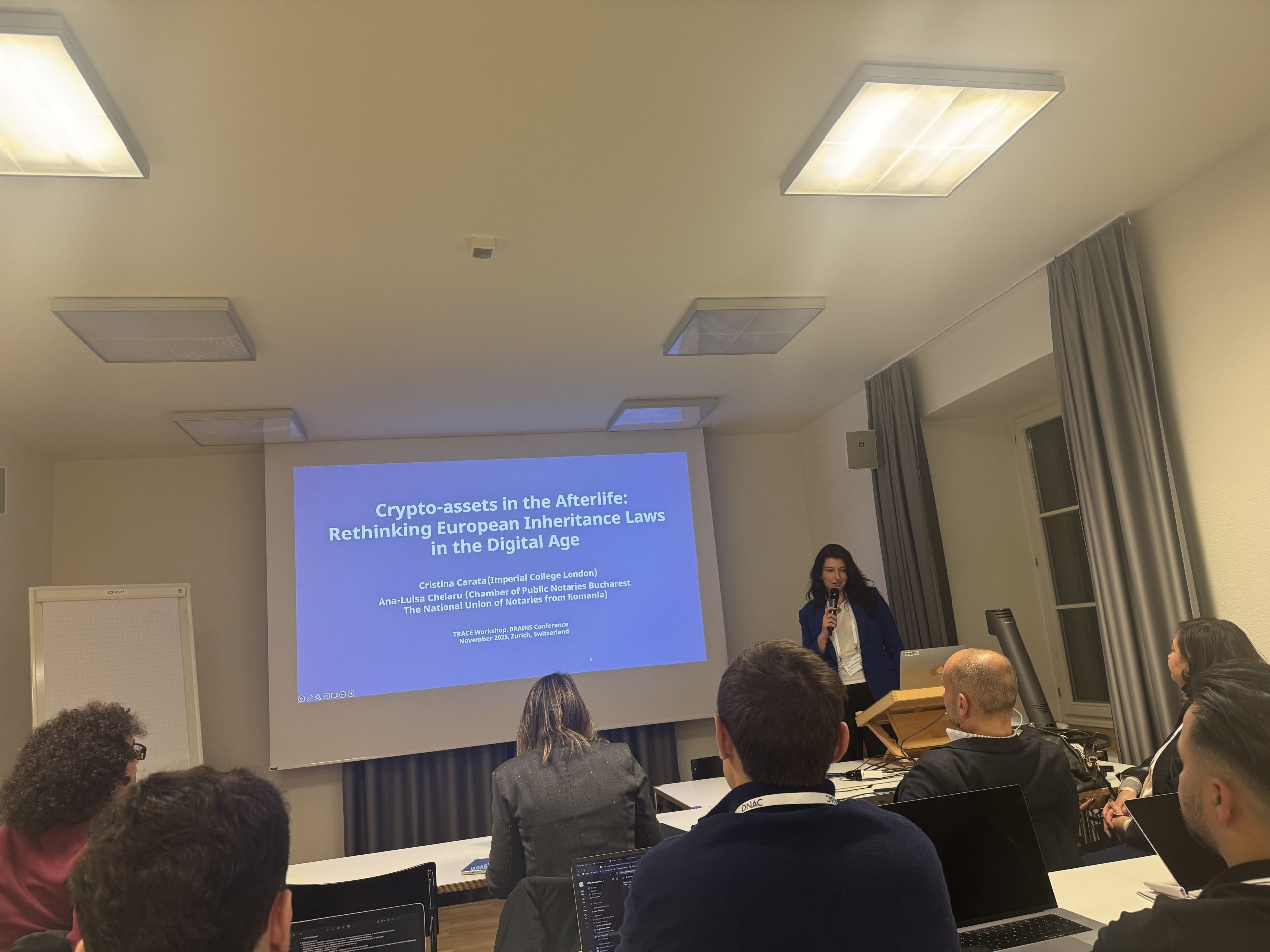 Anul acesta am avut marea bucurie și onoare ca unul dintre articolele pe care le-am scris împreună cu prietena și colega mea, drd. Cristina Carata, intitulat „Criptoactivele în viața de apoi: regândirea legislației europene privind succesiunea în era digitală”, să fie acceptat și selectat pentru prezentare în cadrul Workshop-ului TRACE, organizat în cadrul Conferinței BRAINS 20251, desfășurată la Zürich, Elveția în perioada 18-21 Noiembrie 2025.